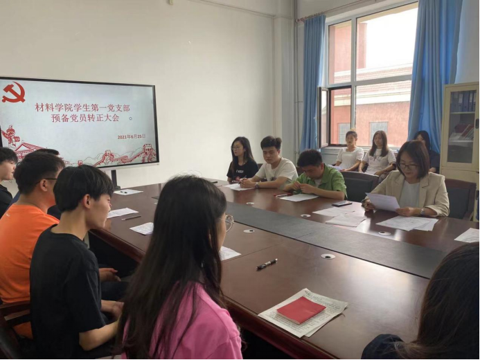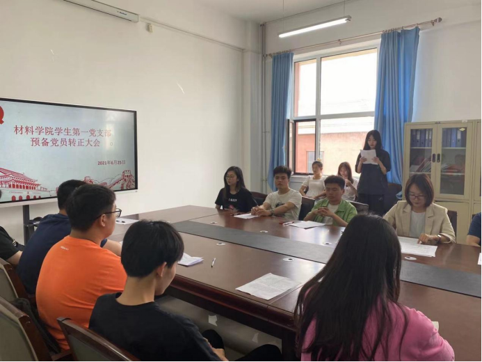 2021年6月25日EMC易倍员工第一党支部于材料楼425会议室召开转正大会。本次大会由党支部书记李爽主持,对颜榕等7名同志是否能如期转正进行讨论和表决。