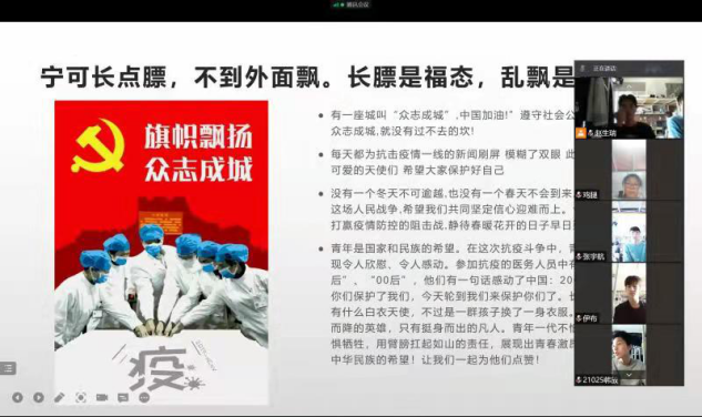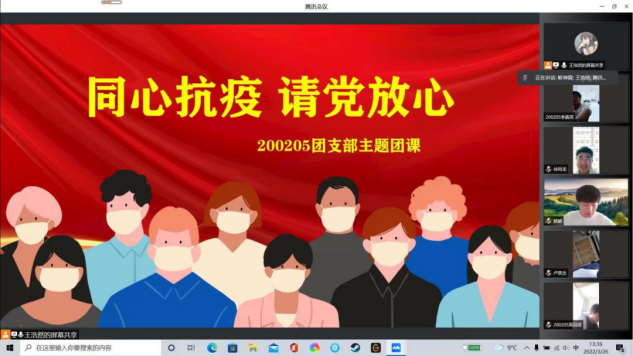 2022年3月26日中午12点30分,研190204团支部通过腾讯会议的方式开展了“同心抗疫,感恩有你”主题团日活动,在疫情时期,团支书江帅呼吁大家,全面增强防范意识,科学自我防护,切实提高政治站位,强化责任担当,认真对待线上学习,按时完成学习任务,众志成城,共克时艰。
