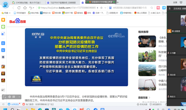 2022年3月27日.210205团支部全体成员通过腾讯会议,在线上共同观看并学习了习总书记关于疫情防控的讲话和相关视频,通过此次学习,一致认为习总书记的重要讲话和一系列重要指示深刻阐述了疫情防控的重大意义、基本策略和重点举措,作为践行“两个维护”的第一方阵,中央和国家机关青年在疫情防控战役中肩负着特殊重要职责,要进一步增强“四个意识”、坚定“四个自信”、做到“两个维护”,带头坚决贯彻落实习总书记重要讲话和一系列重要指示精神,牢记人民利益高于一切,紧密结合岗位职责,科学研判疫情形势,准确把握疫情变化,不断完善防治举措,坚持以科学的方法切实提高疫情防控的针对性和有效性,从自身做起,以实际行动践行听党话。