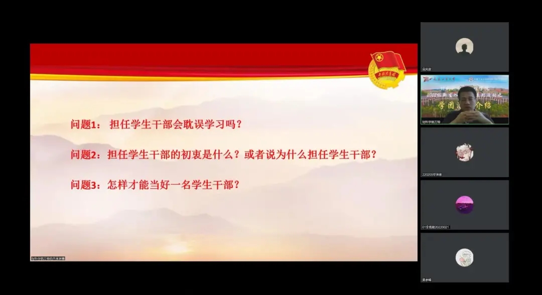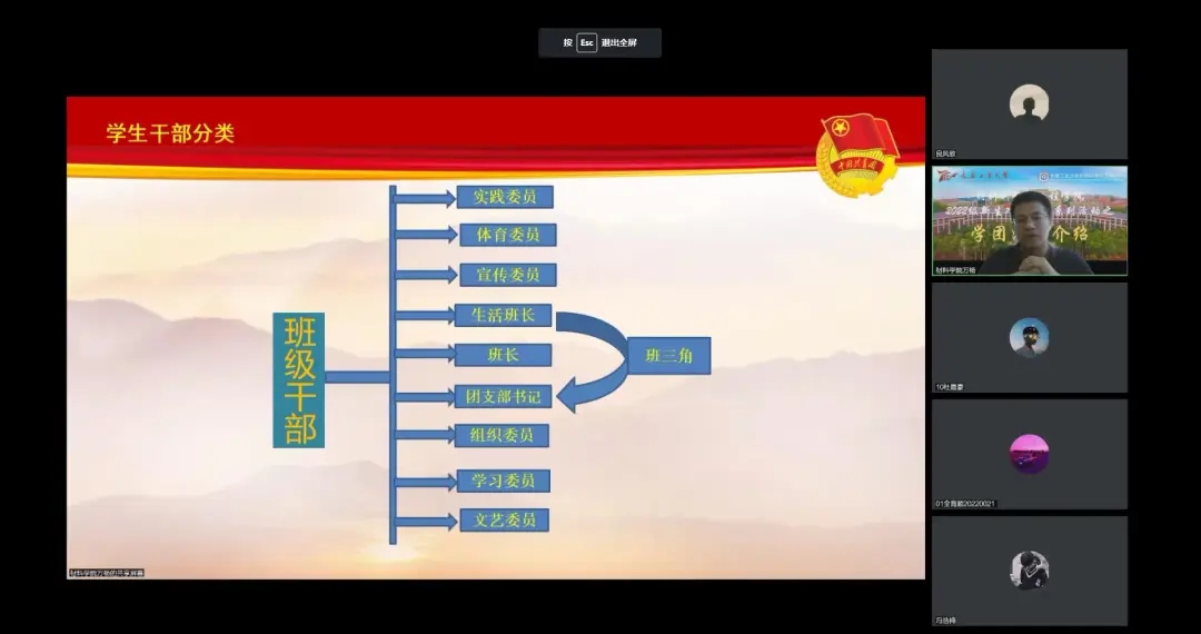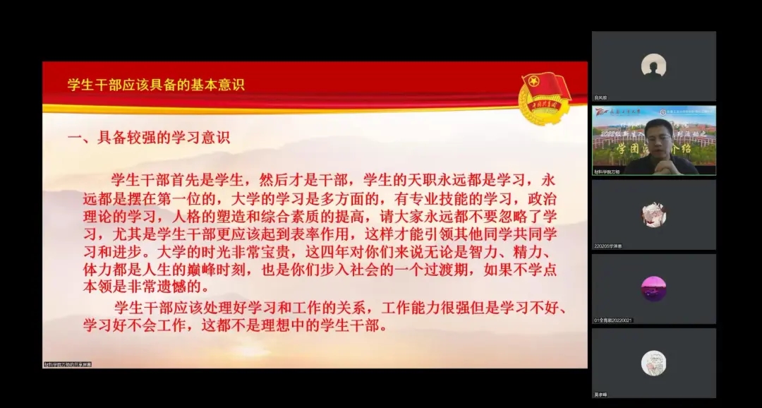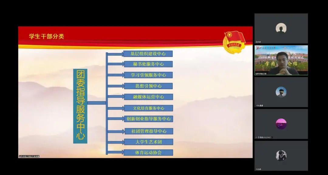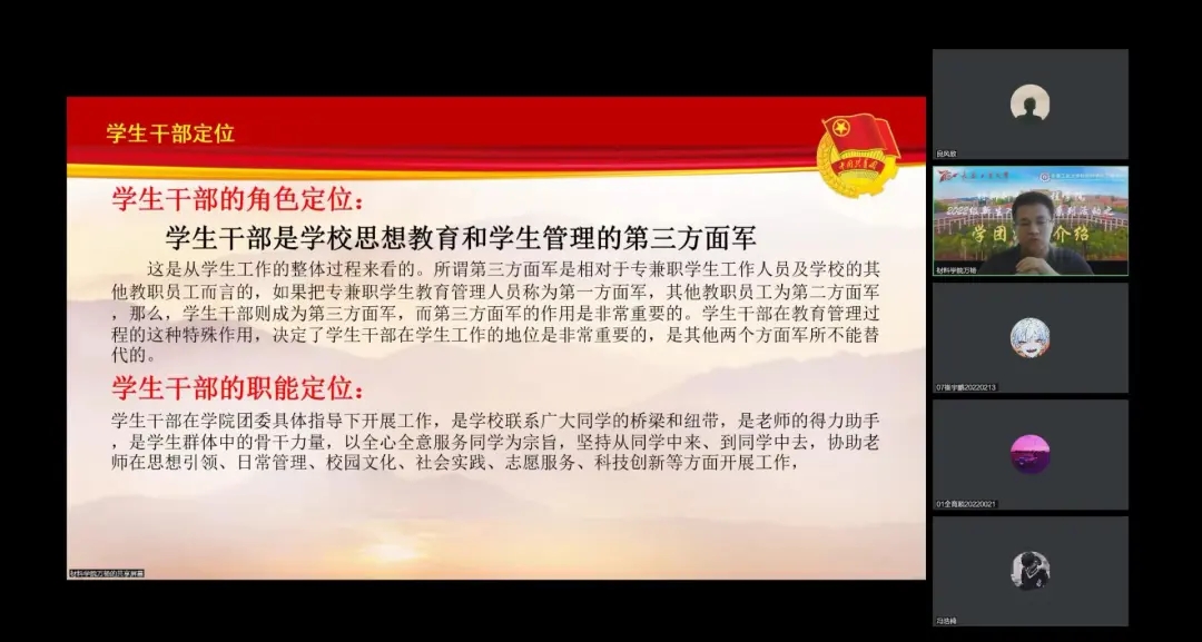材院网讯(通讯员冷鹏飞)2022年9月10日上午9:00,EMC易倍于线上开展2022级新生入学教育系列活动之学团活动专题培训会。本次培训会由公司团委书记万杨主讲,培训内容主要从公司员工干部的职能定位、管理机制、相关岗位需求以及员工干部所需的基本意识展开。2022级全体新生参加此次培训会。
