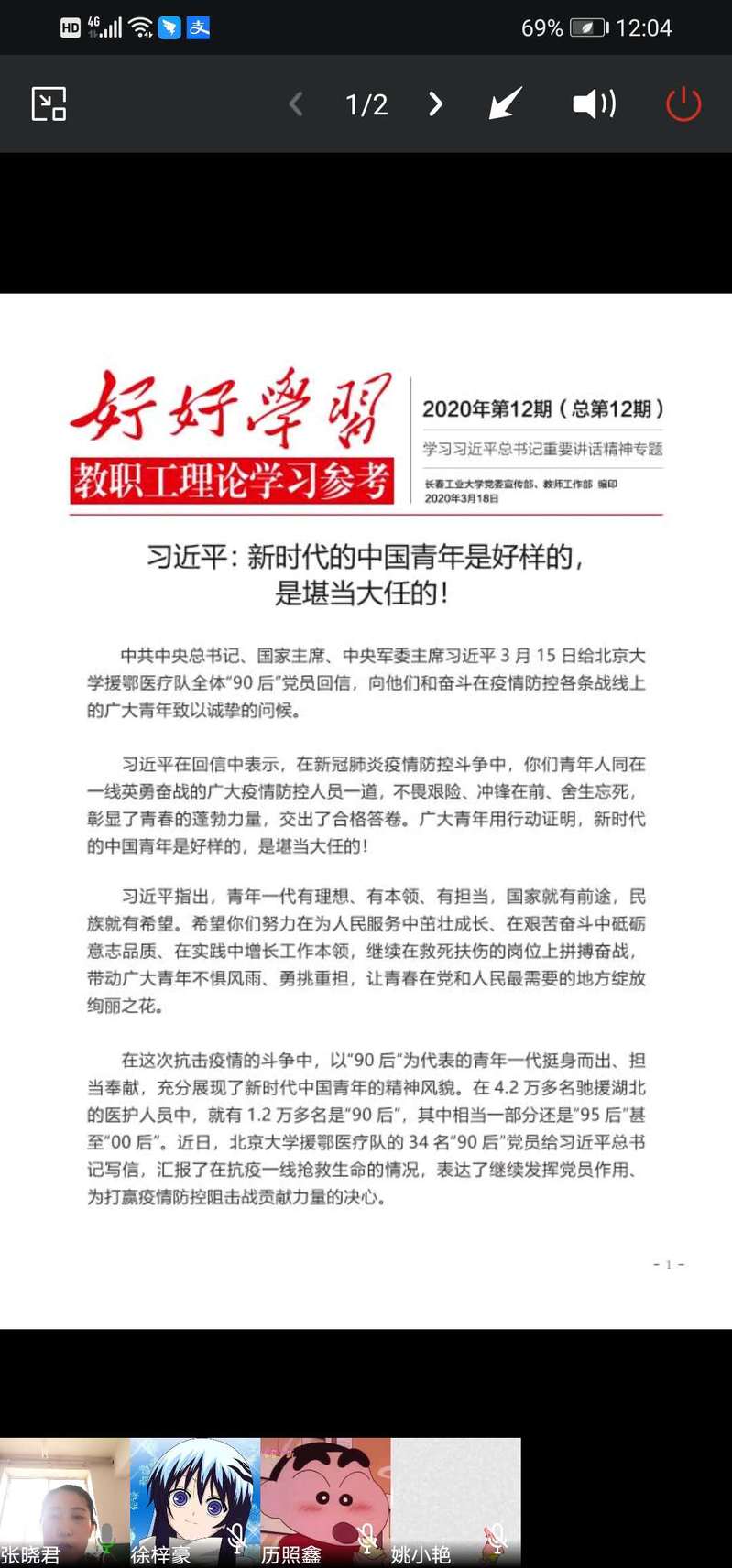 本次活动围绕习近平总书记重要讲话精神专题:新时代的中国青年是好样的,是堪当大任的;习近平给北京大学援鄂医疗队全体“90后”党员的回信;习近平:决不能让来之不易的疫情防控持续向好形势发生逆转;习近平战“疫”高频词等四方面内容进行。随后,支部开展了防疫理论知识学习竞赛,党员们态度积极认真,在规定的时间内高质量的完成了竞赛答题。