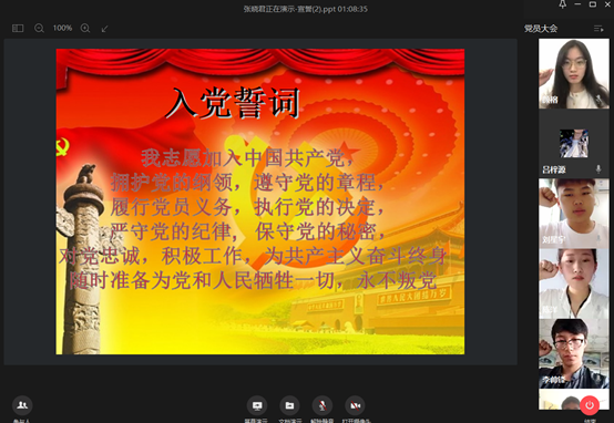 会议过程严肃、孙浩、王民焕、崔桂媛、李春玲、李帅峰、杨思絮张泽楠、李卓睿、吕梓源九位同学在宣读《入党申请书》的同时就进入大学以来的思想、学习、工作、生活等方面向党组织进行了深入地汇报。第一介绍人吴文东书记和第二介绍人张晓君老师做培养报告,并发表了意见,就发展对象的个人审查情况进行介绍,培养人补充意见,让支部成员和与参会的同学对每一位发展对象有了比较全面的认识。会议采用无记名投票方式对今天所发展的九位拟发展对象是否接受为中共预备党员进行表决。最终,孙浩、王民焕、崔桂媛、李春玲、李帅峰、杨思絮张泽楠、李卓睿、吕梓源九位同学都获得了全票通过,顺利成为中共预备党员。在刘星宇同志的带领下,进行了宣誓。