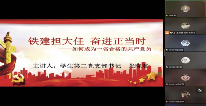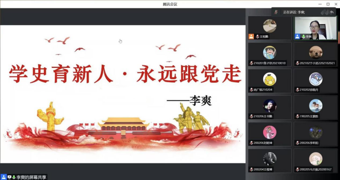 辅导员李爽就“建党一百年的四个历史时期”为主题开展党课培训,一百年来,中国共产党弘扬伟大建党精神,在长期奋斗中构建起中国共产党人的精神谱系,锤炼出鲜明的政治品格。并以各个时期的优秀人物的先进事迹教育同学们要积极发挥模范带头作用,不惜牺牲个人的一切,为共产主义奋斗终生,要有光明正大的作风和大公无私的气节,树立和保持共产党员的浩然之气。
